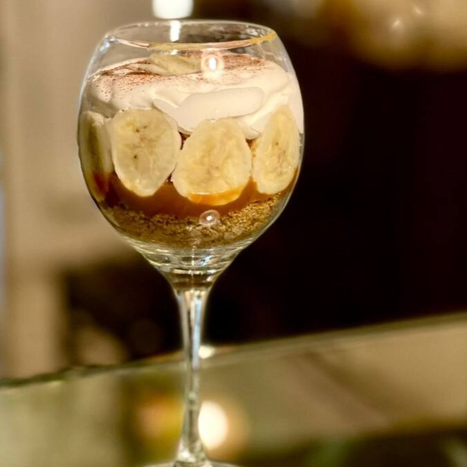 Delicosa banoffe com tradicional caramelo toffee, banana, chantilly e raspas de chocolate. Opção de Viagem servida no copo.