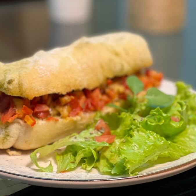 Baguete recheada com pesto aromático, tomate seco e tomate fresco picado na ponta da faca, temperado com um toque de mel, sal e finalizado com lascas de parmesão.