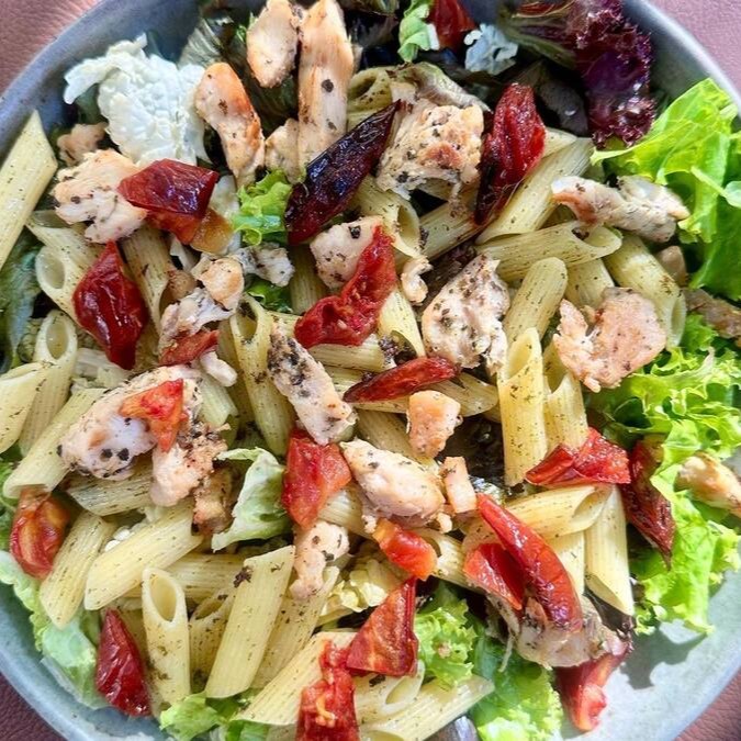 Uma combinação leve e sofisticada: folhas frescas e crocantes servem de base para o frango grelhado suculento, harmonizado com penne al dente ao pesto aromático. O sabor intenso do tomate seco contrasta com a delicadeza dos ingredientes, enquanto o parmesão finaliza trazendo um toque marcante e irresistível.