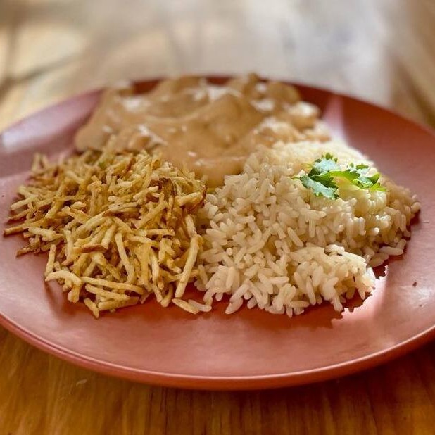 Strogonoff, arroz e batata palha.