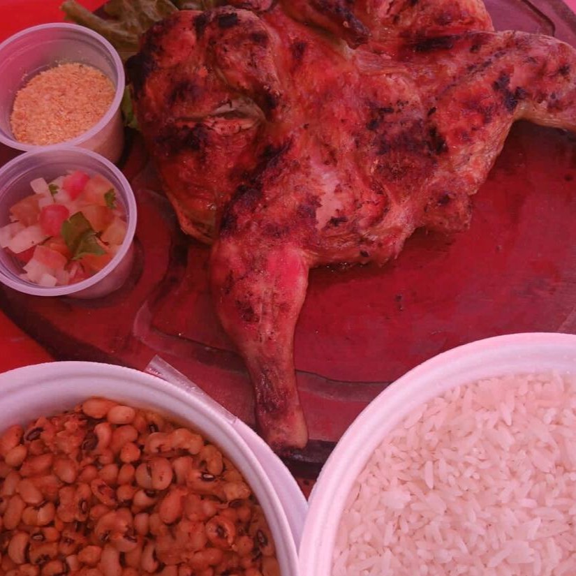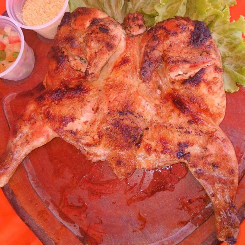 Galeto temperado, assado na brasa, acompanha porçao de arroz, feijão macassar, vinagrete, farofa, manteiga de garrafa e creme de alho.
