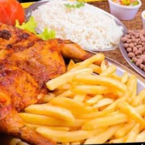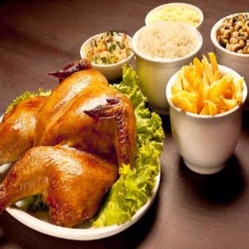 Galeto que acompanham Arroz, Feijão macassar, Batata frita, Vinagrete e Farofa.