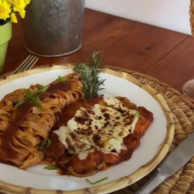 Compartilhe a Parmegiana de Frango, com spaghetti, molho de tomate e queijo parmesão. Perfeita para duas pessoas.