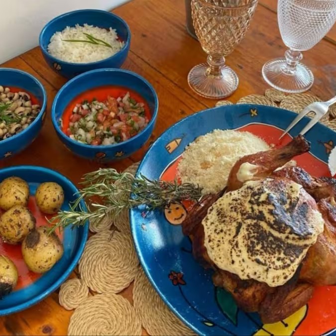 Desfrute do sabor clássico do Galeto Tradicional Completo, com arroz, feijão macassar, farofa, vinagrete e batatas rústicas assadas ou batata frita. Uma escolha tradicional e deliciosa. Serve 4 pessoas