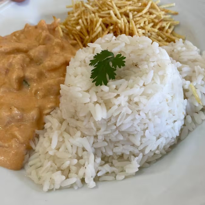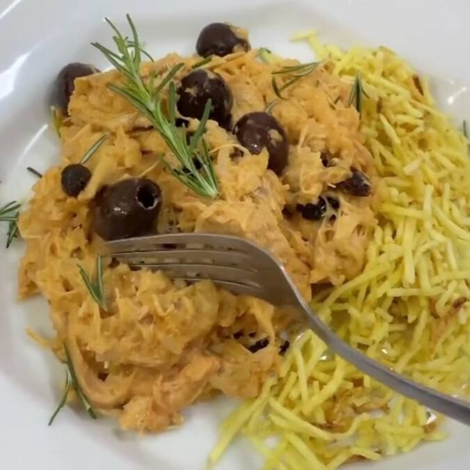 Aprecie o Fricassê de Frango, com risoto de frango e batata palha. Uma combinação cremosa e crocante que encanta o paladar.