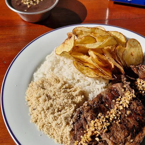 Feijão preto, arroz , farofa, vinagrete e batata rustica
