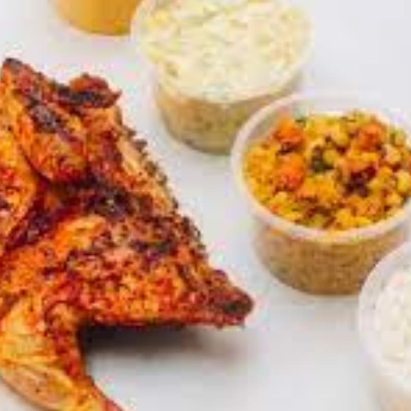 Metade do nosso galeto de máquina, marinado. (acompanha vinagrete, farrofa, arroz e feijão macassa)