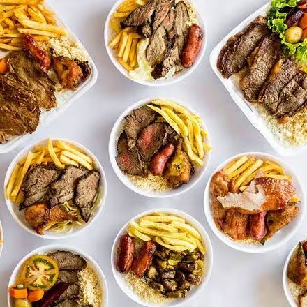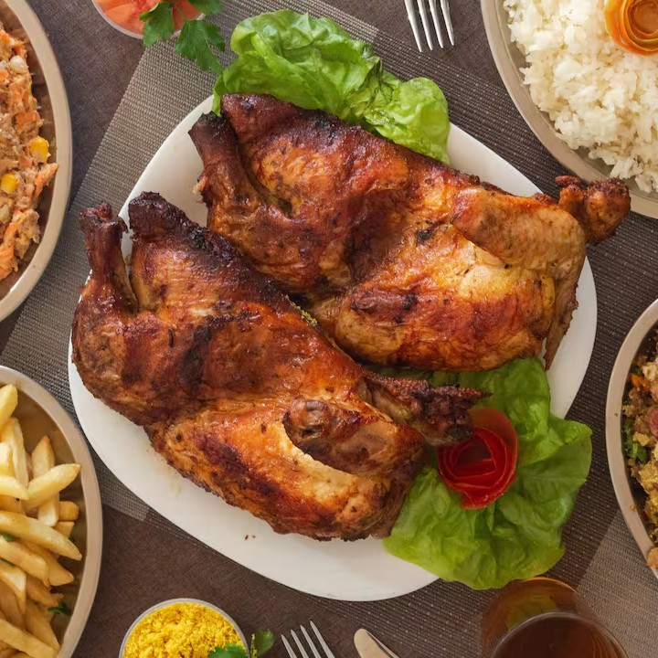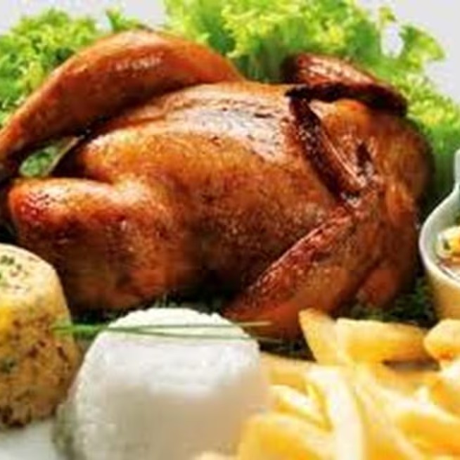 Acompanha arroz, feijão macassar, batata frita, vinagrete, farofa e meio galeto