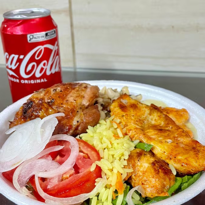 Acompanhamentos são arroz, feijão macassar, batata frita, vinagrete, farofa e o galeto o inteiro