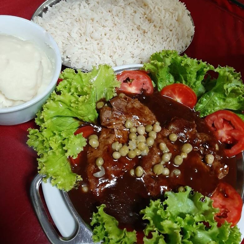 (carne desfiada, pimentão verde, ao molho shoyu e acompanha risoto chop-suey e agridoce) / Serve Duas Pessoas
