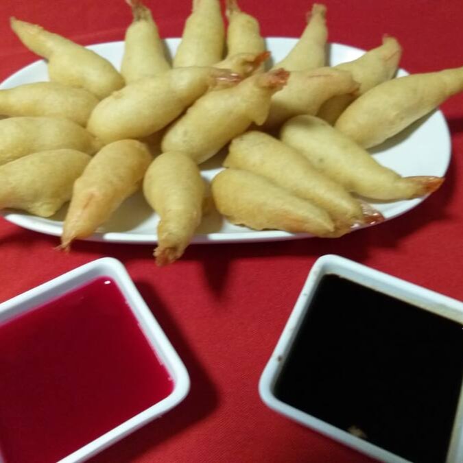 (Camarão empanado com cubos de verduras ,ao molho de tomate ,gratinado com queijo mozarela ,acompanha arroz a lá agrega e fritas ) serve uma pessoa