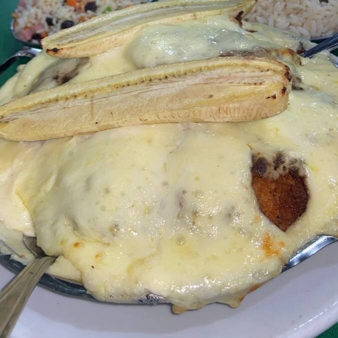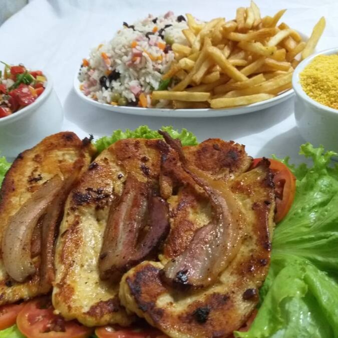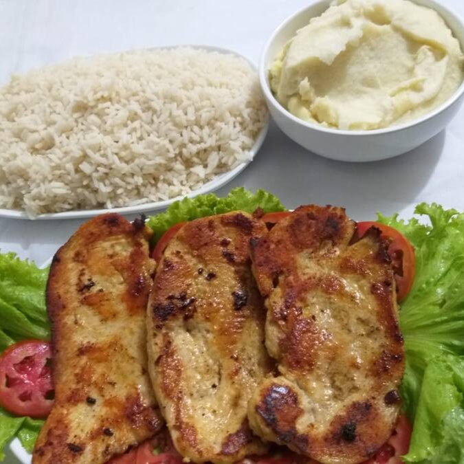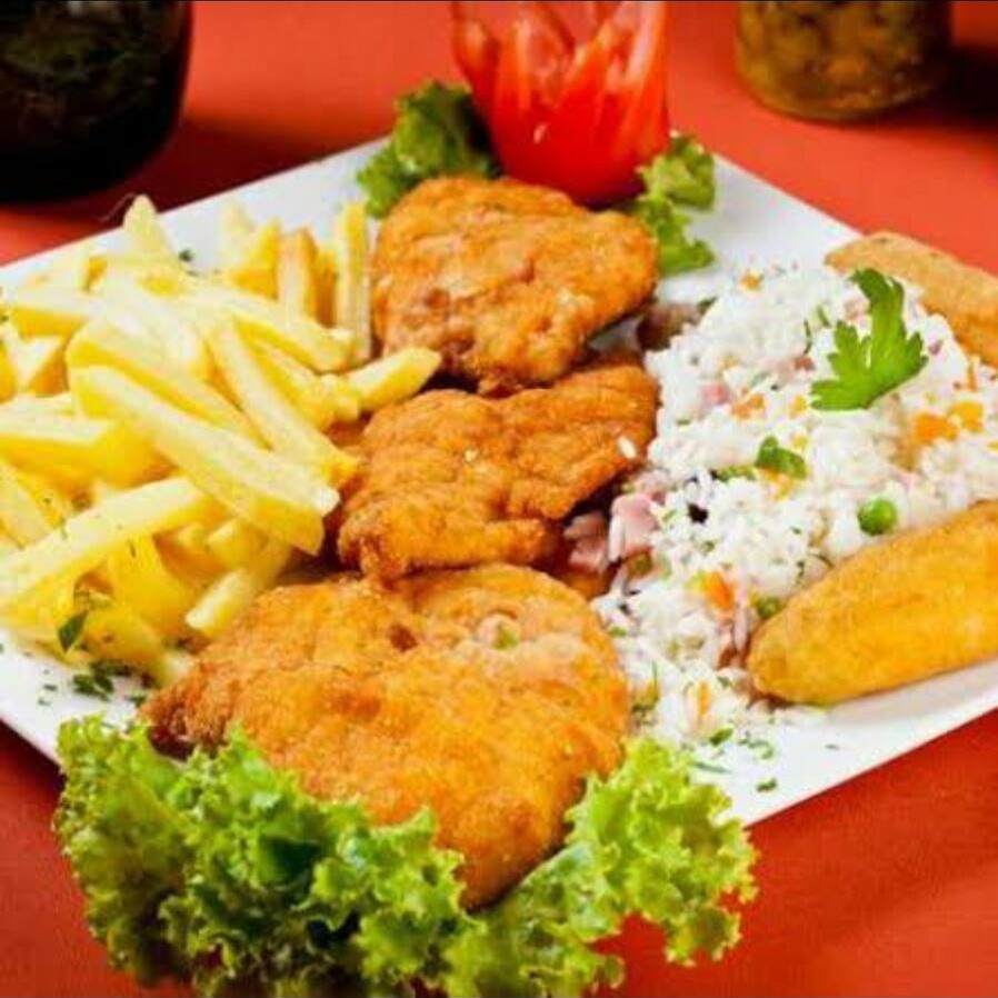 (Filé de frango à milanesa, arroz a la grega, fritas e uma banana à milanesa) / Serve 2 Pessoas