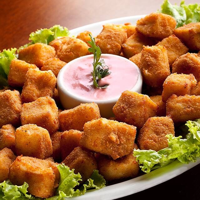 (cubos de queijo coalho empanados e molho rosê)