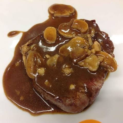 (fatias de filé com champignon ao molho de strogonoff, arroz branco e purê)