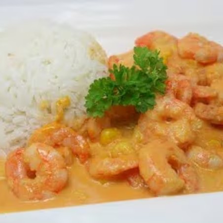 (camarões ao molho de coco, batatas cozidas, verduras, ervilha, acompanha arroz branco e purê) / Serve Duas Pessoas