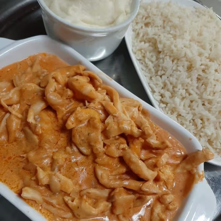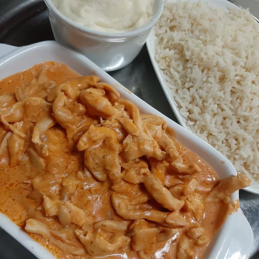 (Fatias de frango com champignon ao molho de estrogonofe com arroz branco e purê) / Serve 2 Pessoas