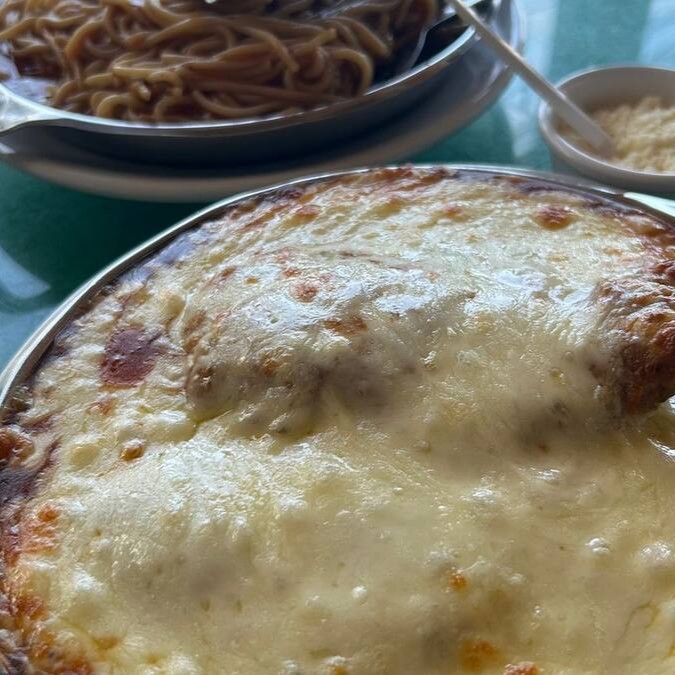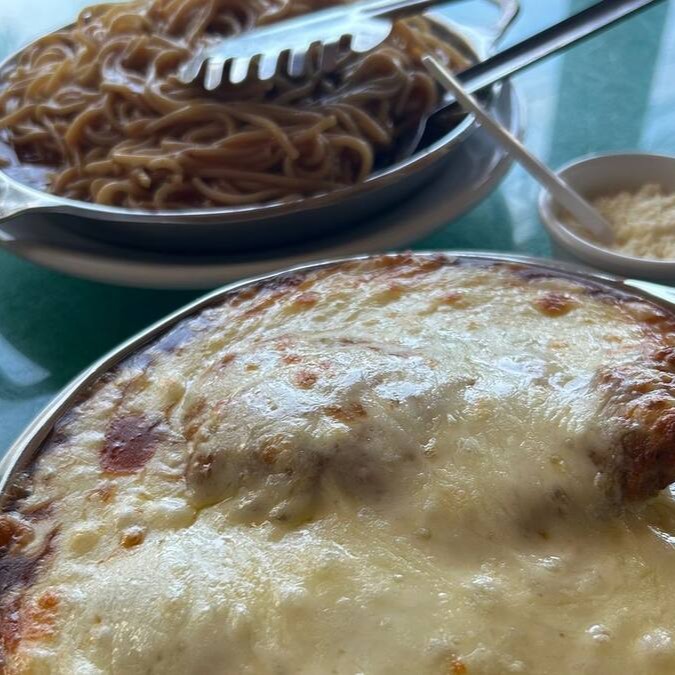 (filé à milanesa ao molho de tomate, gratinado com mussarela e espaguete ao molho)