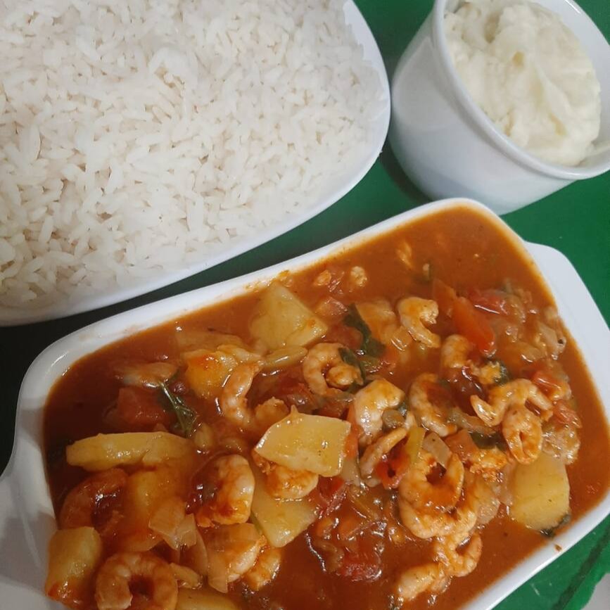 (Camarão ao molho de tomate ,batatas cozidas ,verduras arroz branco e purê ) serve uma pessoa
