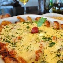 (camarões empanados com cubos de verdura, ao molho de tomate, gratinado com queijo mussarela, acompanha arroz branco e purê) / Serve Duas Pessoas