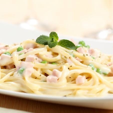 (espaguete, presunto, molho branco, milho e ervilha) / Serve 2 Pessoas