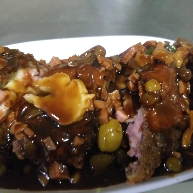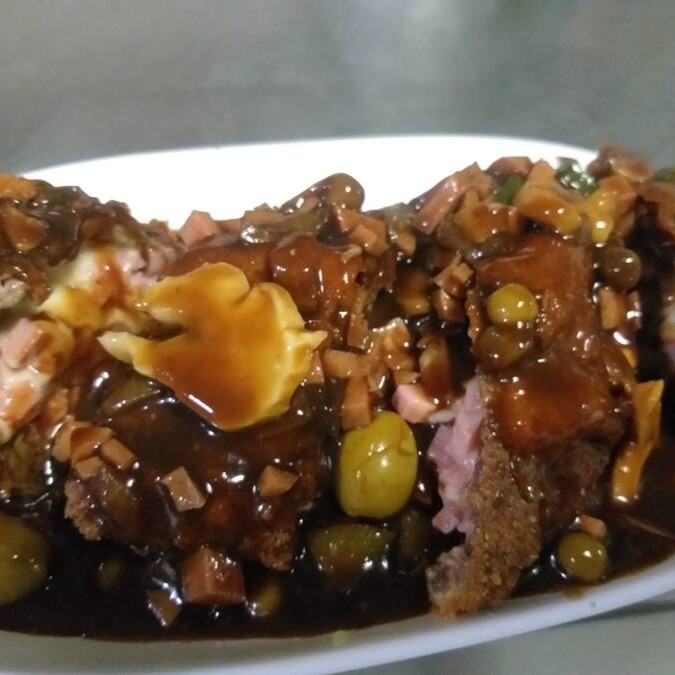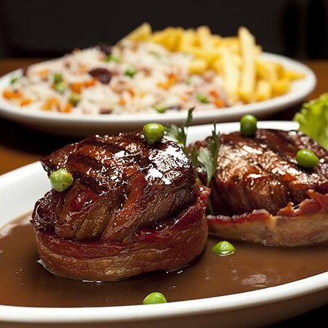 (filé recheado com queijo mussarela e presunto ao molho chateaubriand, arroz a la grega e fritas)