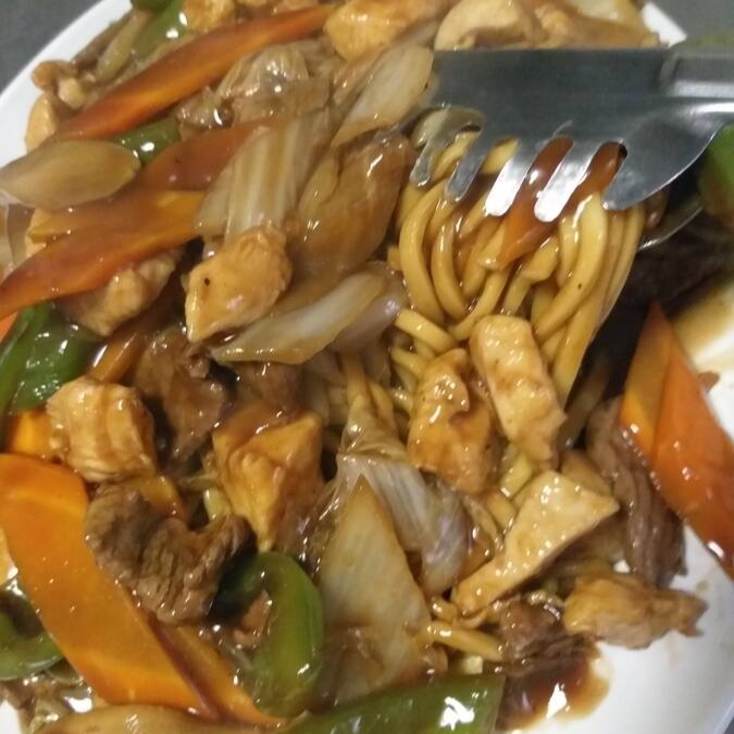 (macarrão, carne, frango, presunto, acelga, cenoura, chuchu, pimentão, ao molho shoyu e acompanha agridoce)