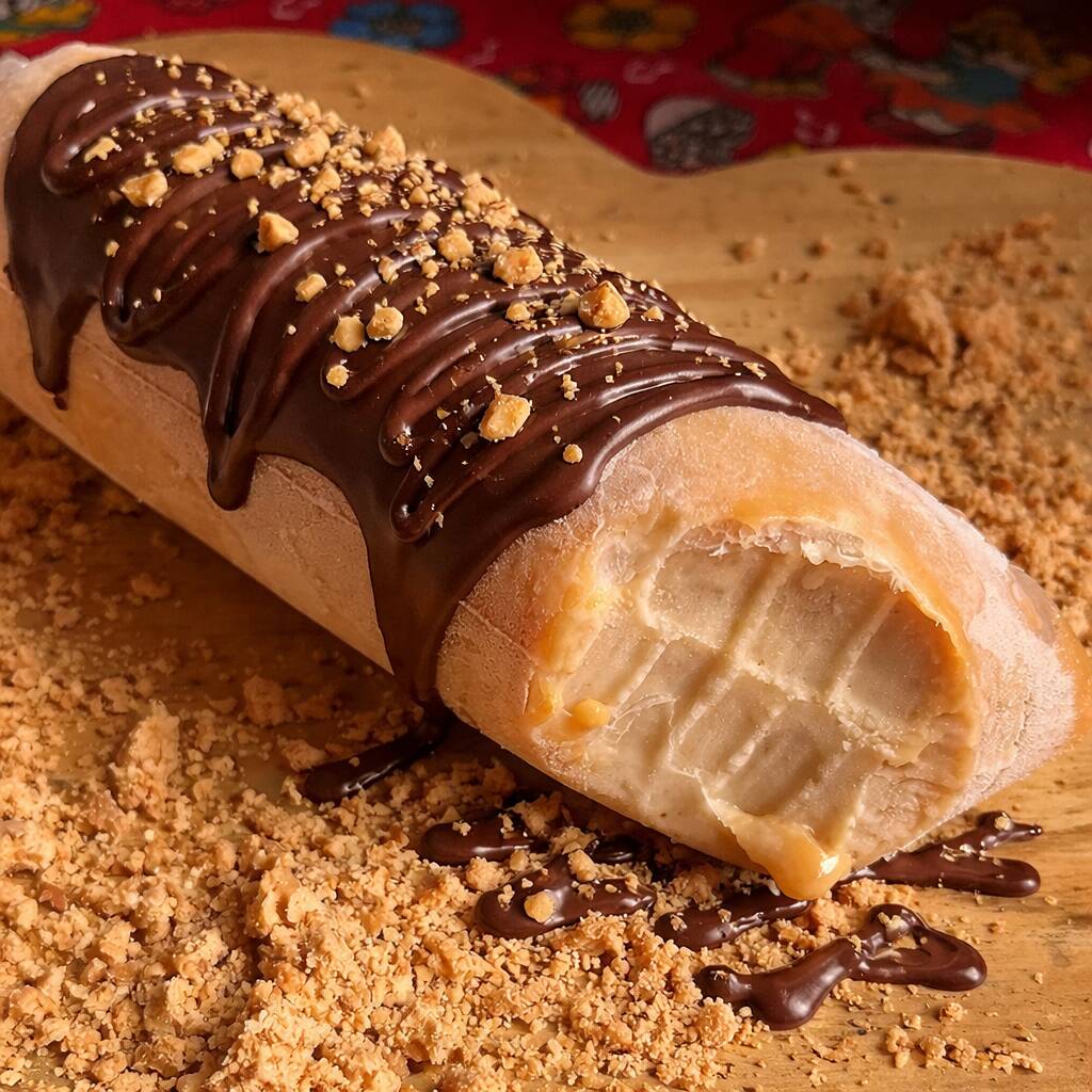 Sacolé gourmet super cremoso de paçoca com chocolate, coberto com uma deliciosa camada de chocolate derretido e finalizado com pedaços crocantes de paçoca. Uma combinação irresistível do sabor marcante do amendoim com a intensidade do chocolate, resultando em uma sobremesa gelada, cremosa e cheia de textura. 🤎🍫❄️