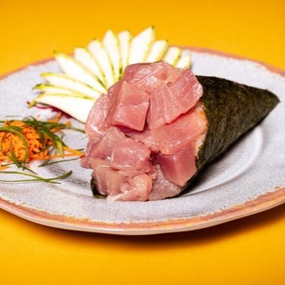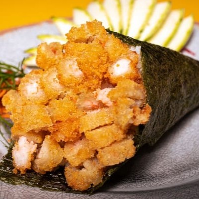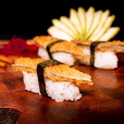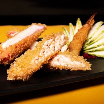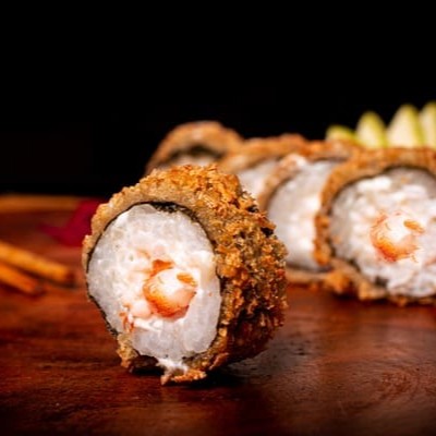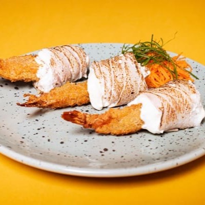 Tempura de Camarão envolto com Atum e Cream Cheese do Chefe.