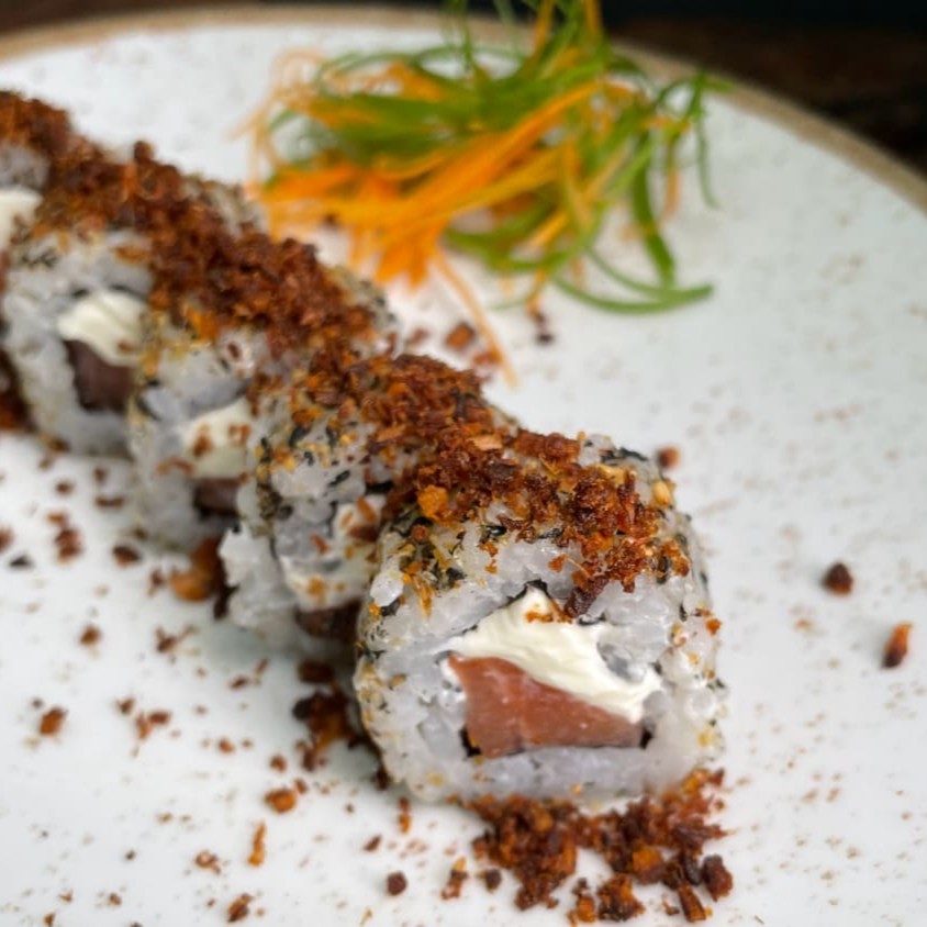Nori(Alga) Envolto No Arroz, Com Recheio De Salmão Natural, Gergelim, Nosso Delicioso Cream Creese Do Chefe E Finalizado Com Farofa De Bacon.