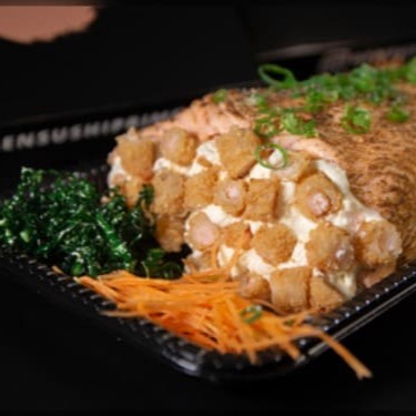 Camada De Arroz Japonês Com Tempero Do Chefe, Recheado Com Salmão Empanado, Gergelim E Nosso Delicioso Cream Creese Do Chefe, Coberto Com Uma Manta De Salmão.