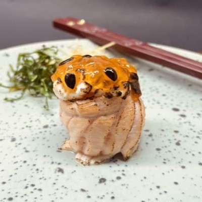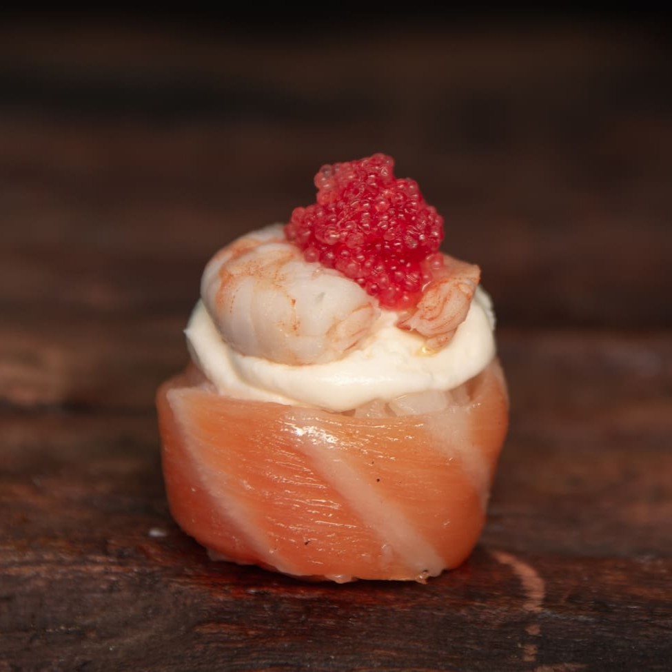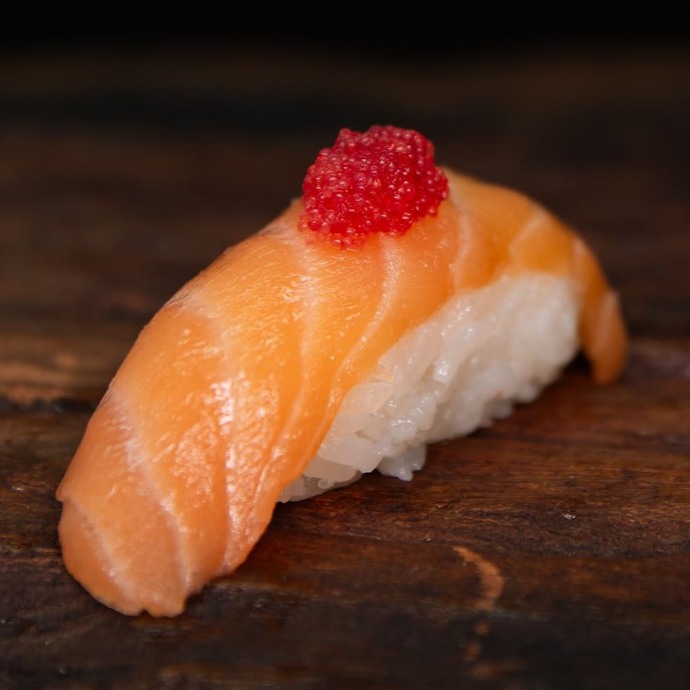 Bolinho De Arroz Com Tempero Do Chefe Com Uma Lâmina De Salmão Por Cima, Finalizado Com Ovas De Peixe.