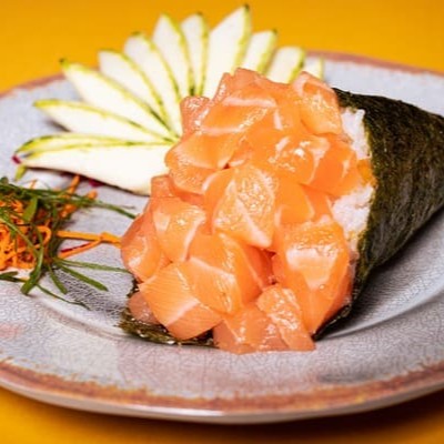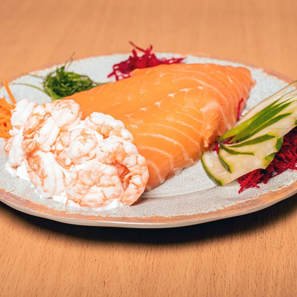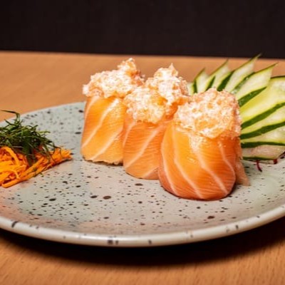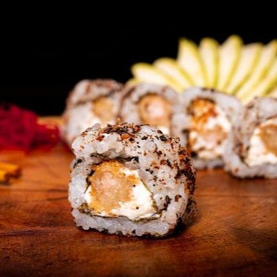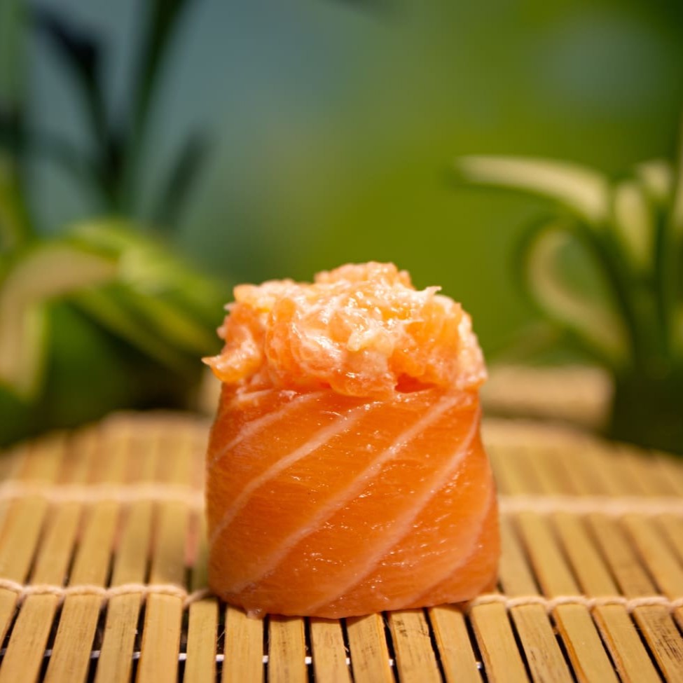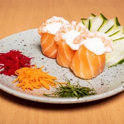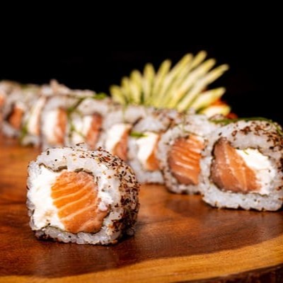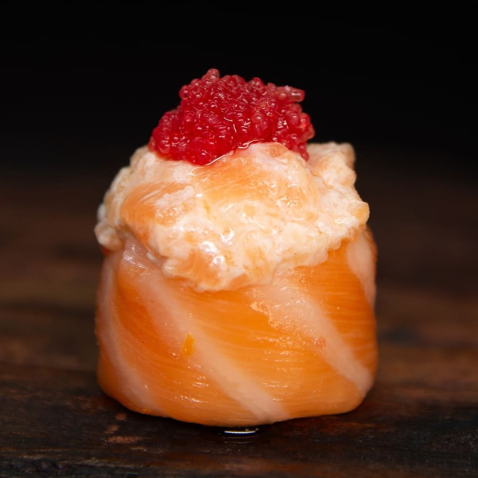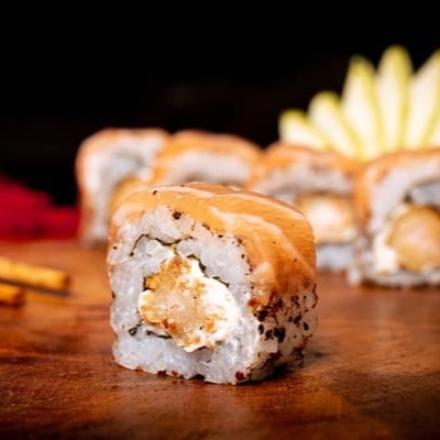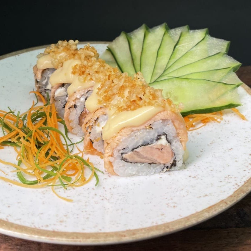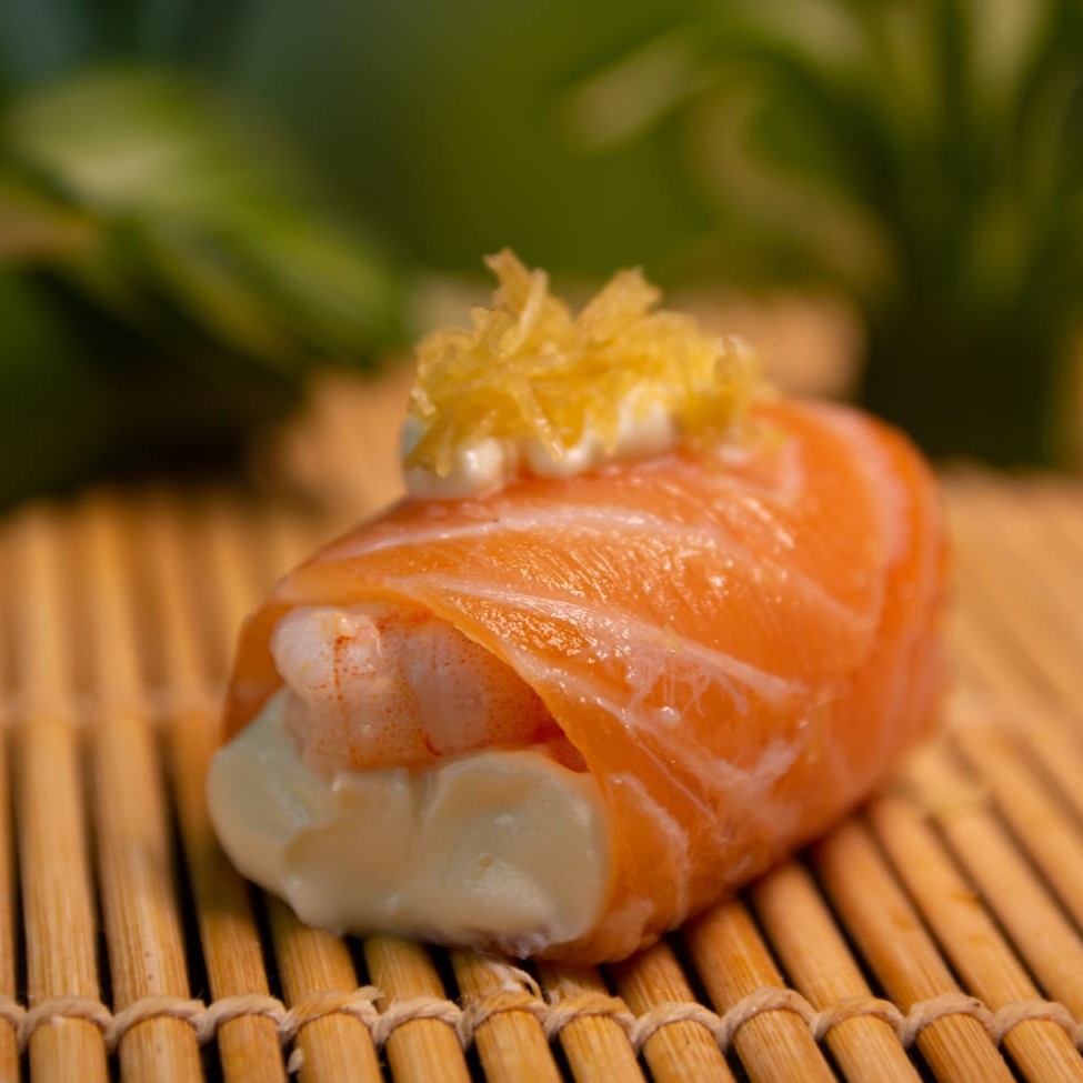 Camada De Arroz Japonês Com Tempero Do Chefe, Recheado Com Camarão Natural, Gergelim E Nosso Delicioso Cream Creese Do Chefe, Envolto Com Uma Manta De Salmão Maçaricado.