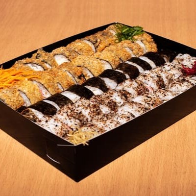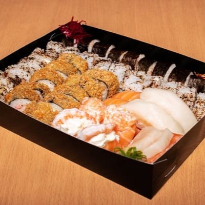 10 cariocas de salmão, 10 hossomakis de salmão, 10 uramakis de camarão empanado, 5 uramakis de salmão, 4 sashimis (2 salmão e 2 peixe branco), 2 joy joy, 2 ebi joy, 4 niguiris ( 2 salmão e 2 peixe branco).