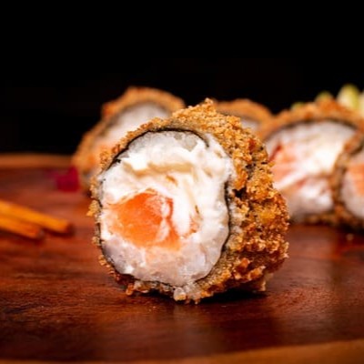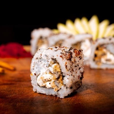 Camada De Arroz Japonês Com Tempero Do Chefe, Recheado Com Camarao Empanado, Skin Empanado, Gergelim E Nosso Delicioso Cream Creese Do Chefe, Coberto Com Uma Manta De Salmão Maçaricado.