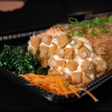 Camada De Arroz Japonês Com Tempero Do Chefe, Recheado Com Camarao Empanado, Gergelim E Nosso Delicioso Cream Creese Do Chefe, Coberto Com Uma Manta De Salmão Maçaricado.