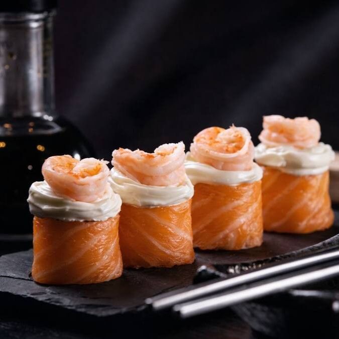 6 peças - Bolinho de arroz envolto na lamina de salmão fresco, cream cheese e camarão selecionado.