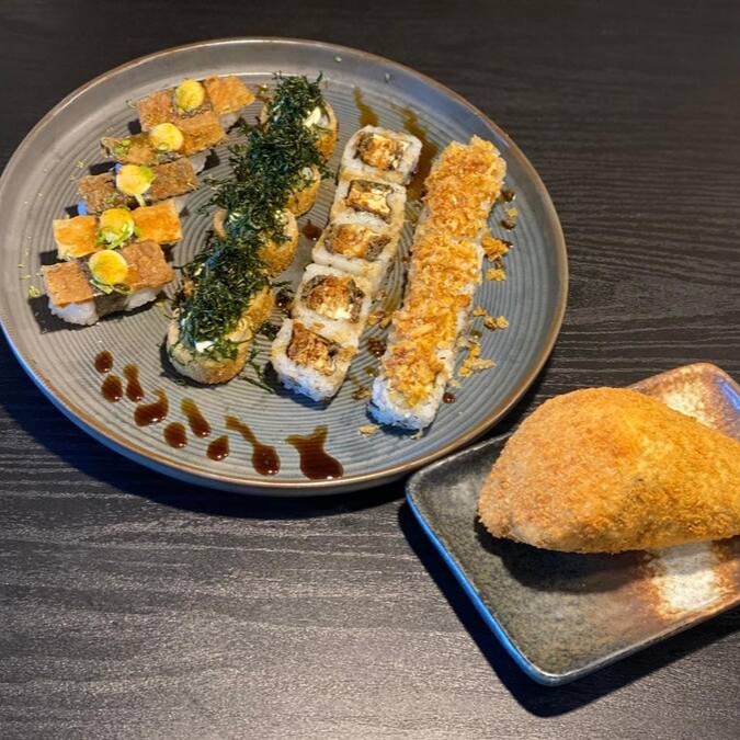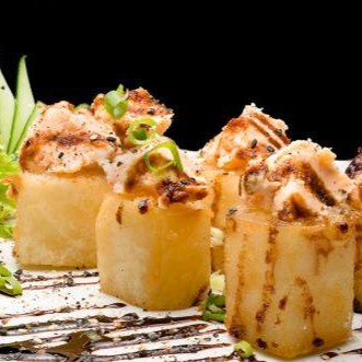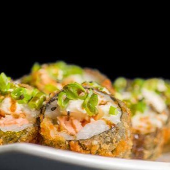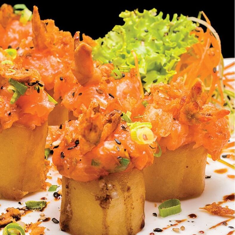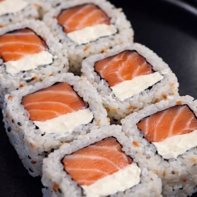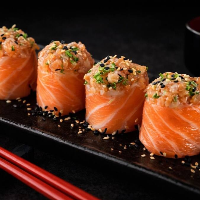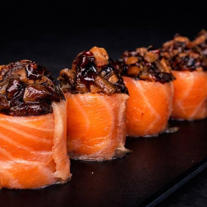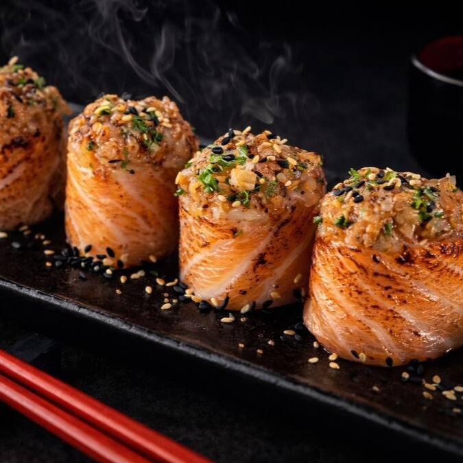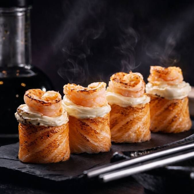 6 peças - Bolinho de arroz envolto em uma lamina de salmão fresco, cream cheese e camarão selecionado, maçaricado com um toque do japa.