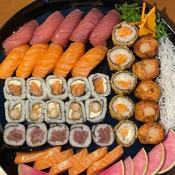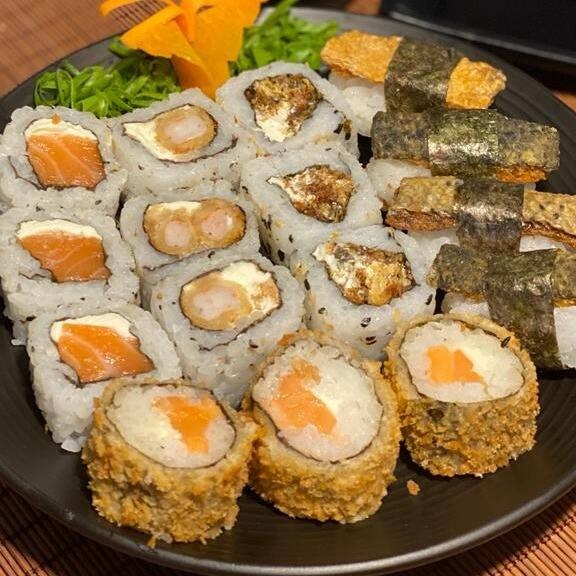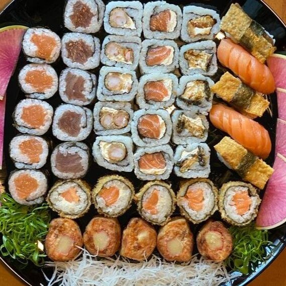 40 Pçs - 5 Huramaki Filadelphia, 5 niguiri de Salmão, 5 niguiri de Atum, 5 Hossomaki Atum, 10 Carioca de Salmão, 5 Tempura Holl (camarão empanado), 5 Sashimi Salmão