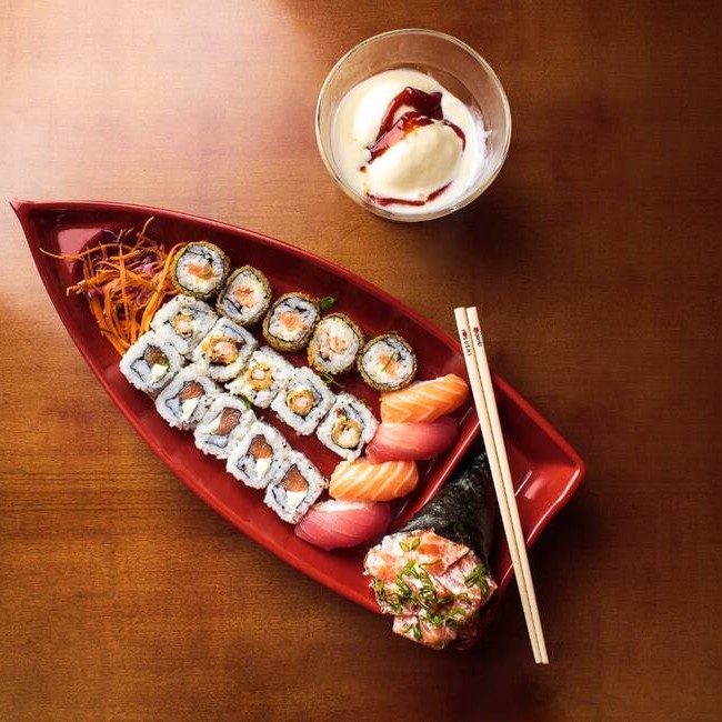 20 Peças - 2 Sushi Salmão, 2 Sushi Atum, 5 Huramaki Salmão, 5 Tempura Holl (camarão empanado), 5 Carioca de Salmão, 1 Temaki Filadelphia, + Sorvete Romeu e Julieta