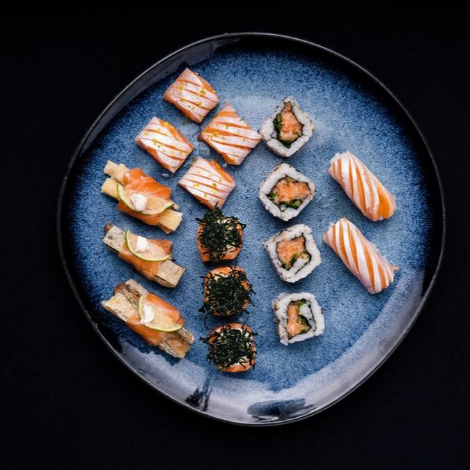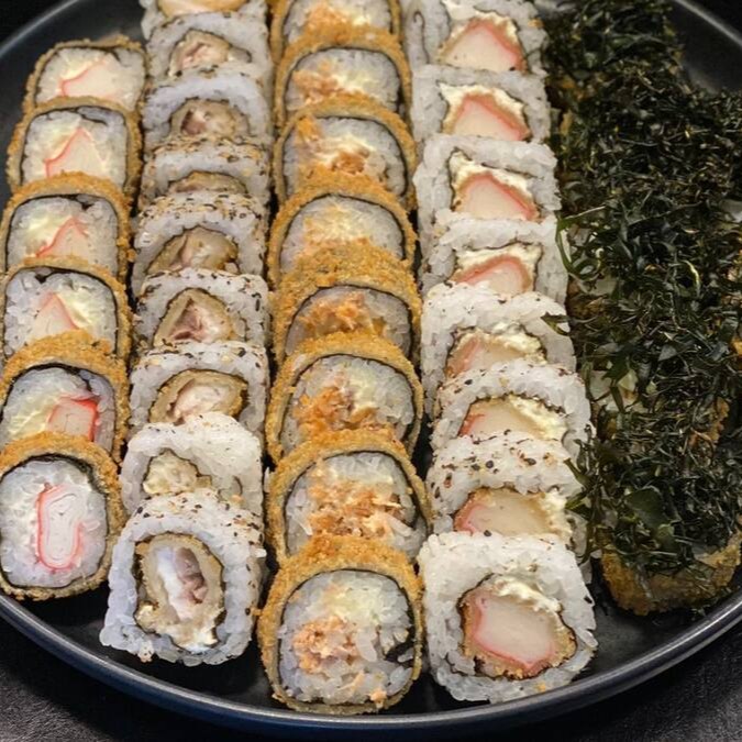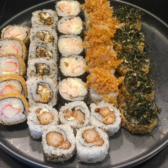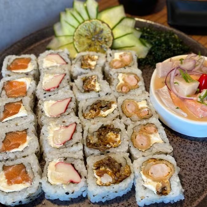 40 Pçs - 5 Huramaki Filadelphia, 5 Huramaki Skin, 5 Huramaki Tempura Roll (camarão empanado), 5 Hossomaki Atum, 5 Hossomaki Salmão, 2 niguiri de Salmão, 3 niguiri de skin, 10 Carioca Salmão