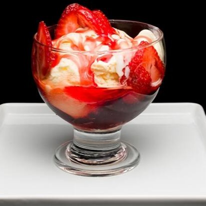 Taça de sorvete de creme com morangos e calda especial.