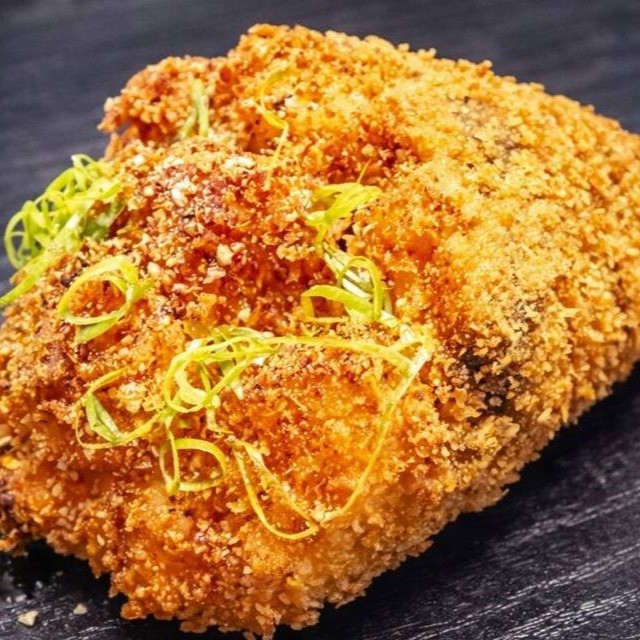 Cubos de salmão fresco, cream cheese empanado em panko e frito.