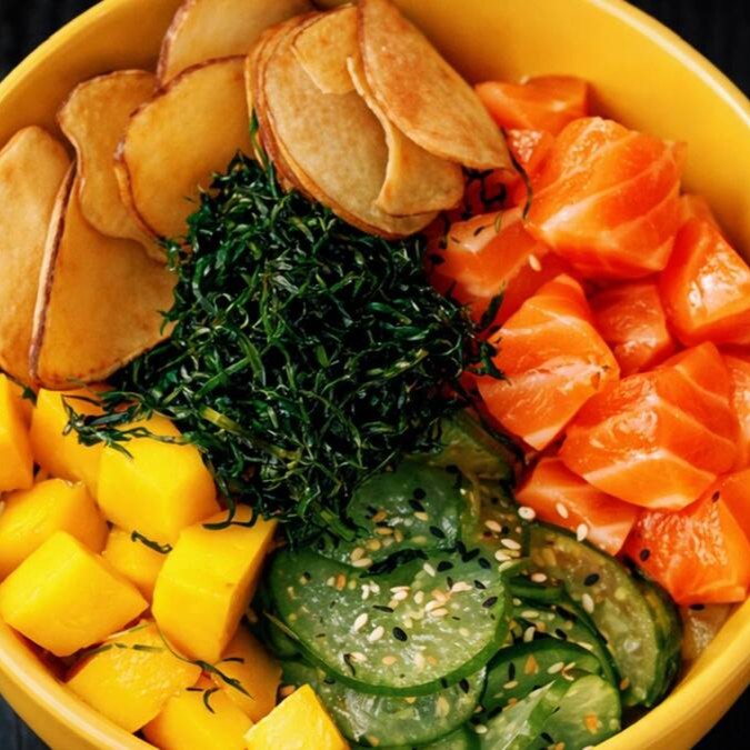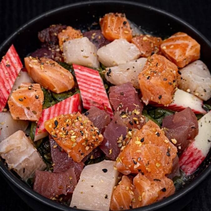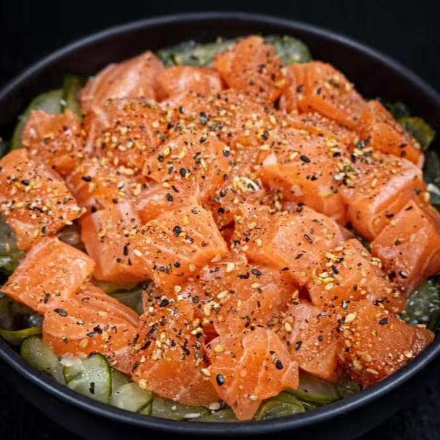 Cubos de salmão, peixe branco, atum e kani frescos, com pepinos em molho oriental com um toque do japa!