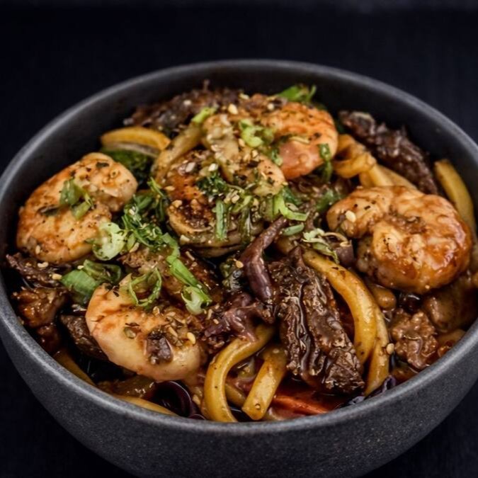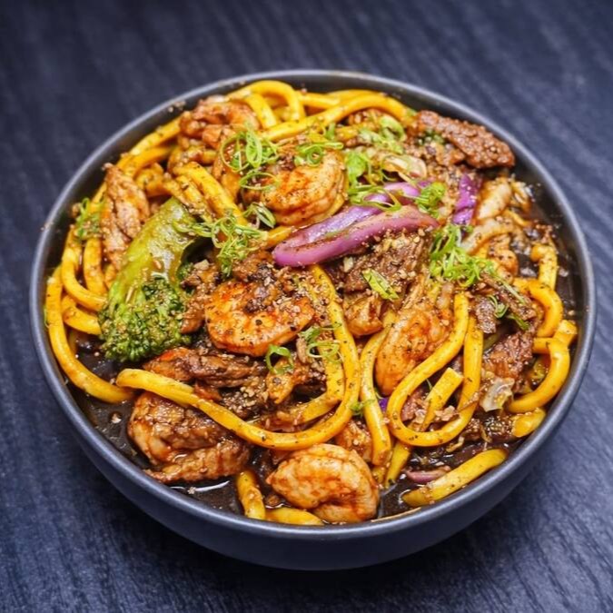 Delicioso Yakisoba, macarrão japonês, molho especial, frango, carnes, camarão e legumes.