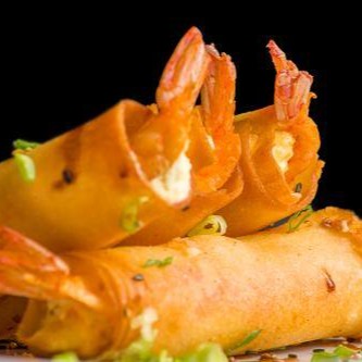 Camarões frescos empanados, cream cheese, cebolinho e gergelim.