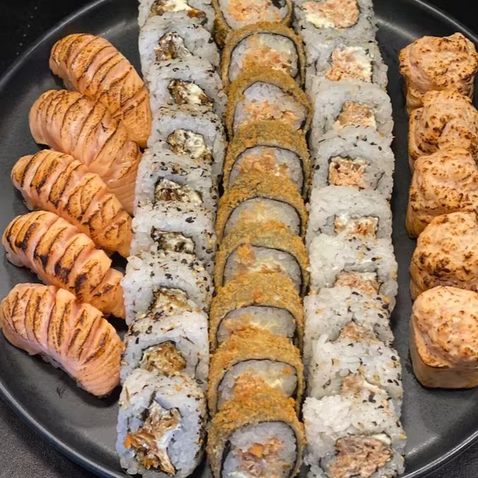 10 carioca de pasta de salmão grelhado, 10 uramaki pasta de salmão grelhado , 10 ura skin , 05 niguiri salmão maçaricado, 05 joe salmão maçaricado.