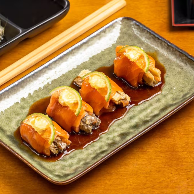 6 peças - camarão selecionado, cream cheese, envolto na lâmina de salmão fresco, maçaricado e um toque de raspa de limão e geleia levemente apimentada.