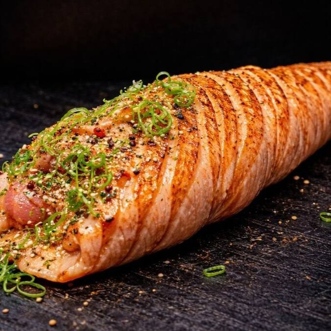 Envolto na lamina de salmão fresco, cubos de salmão natural e cream cheese, maçaricado por fora , com um toque do japa. (em torno de 400g)