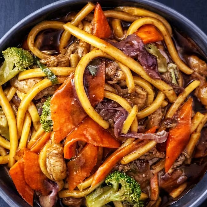 Delicioso Yakissoba, macarrão japonês, molho especial, frango, carnes e legumes.
