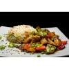 Cubos de frango, legumes puxados ao molho especial, acompanhados por arroz temperado. (Serve 1 pessoa).